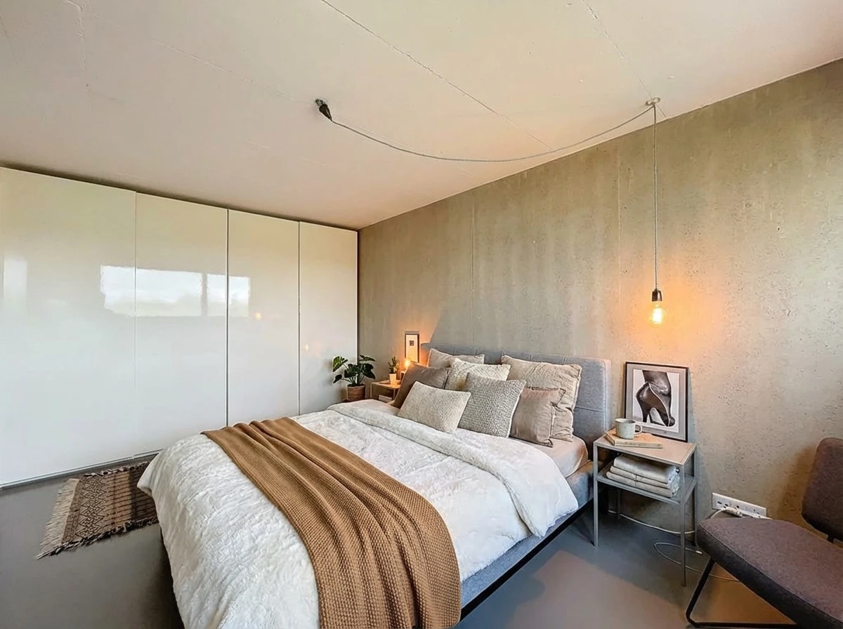 2 chambres à coucher, dont une avec terrasse, offrent calme et luminosité, accompagnées d’une salle de bain élégante.