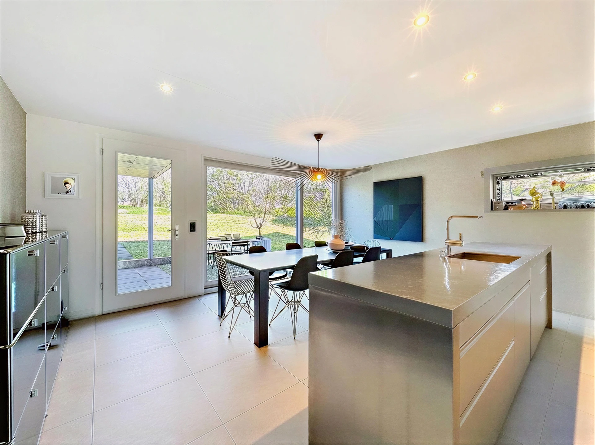 Le salon lumineux, prolonge l’espace vers une première terrasse, tandis que la cuisine ouverte, parfaitement intégrée à la salle à manger, invite à des moments de partage tournés vers une seconde terrasse. Le tout entouré d’un magnifique jardin arboré.