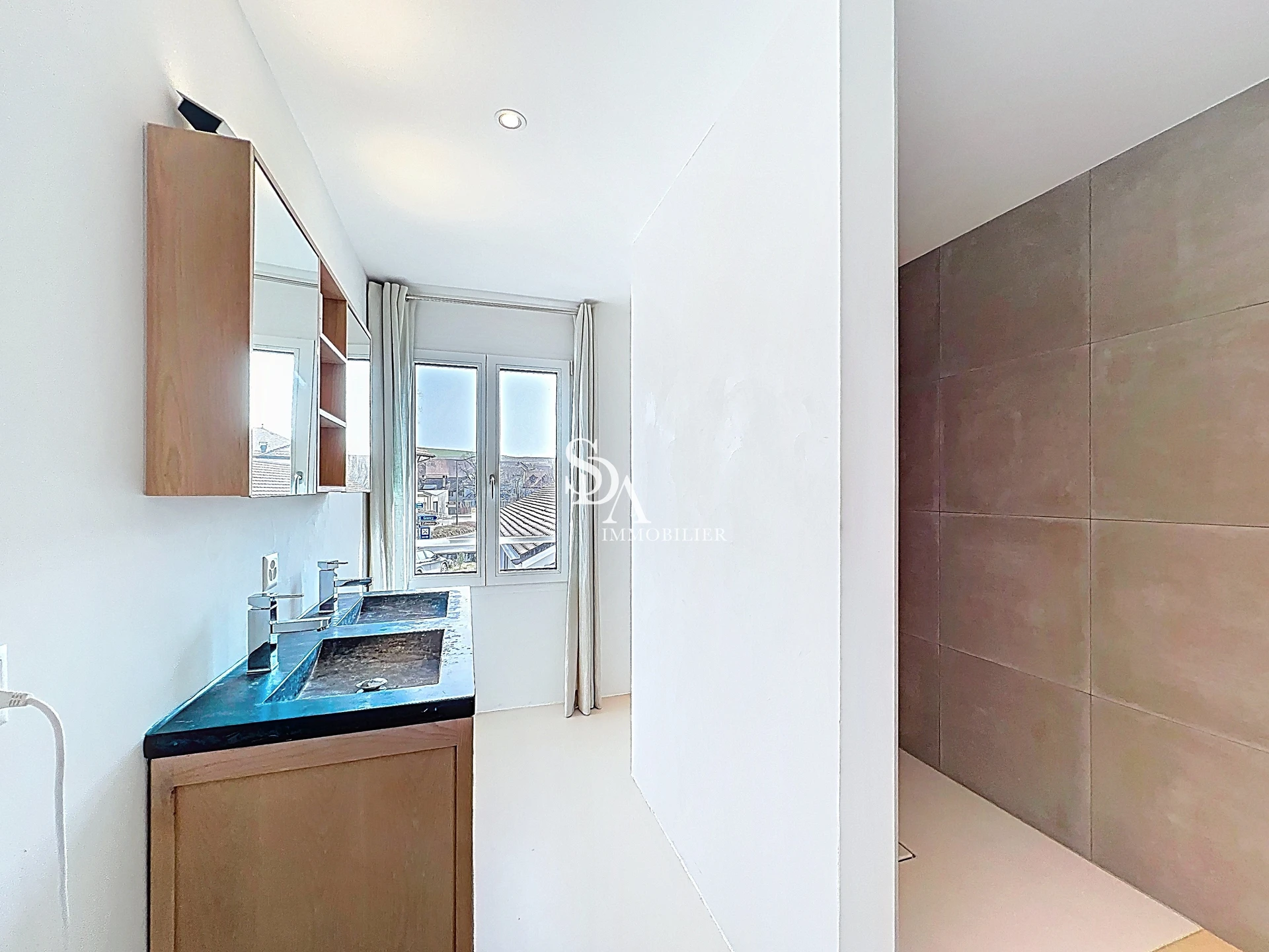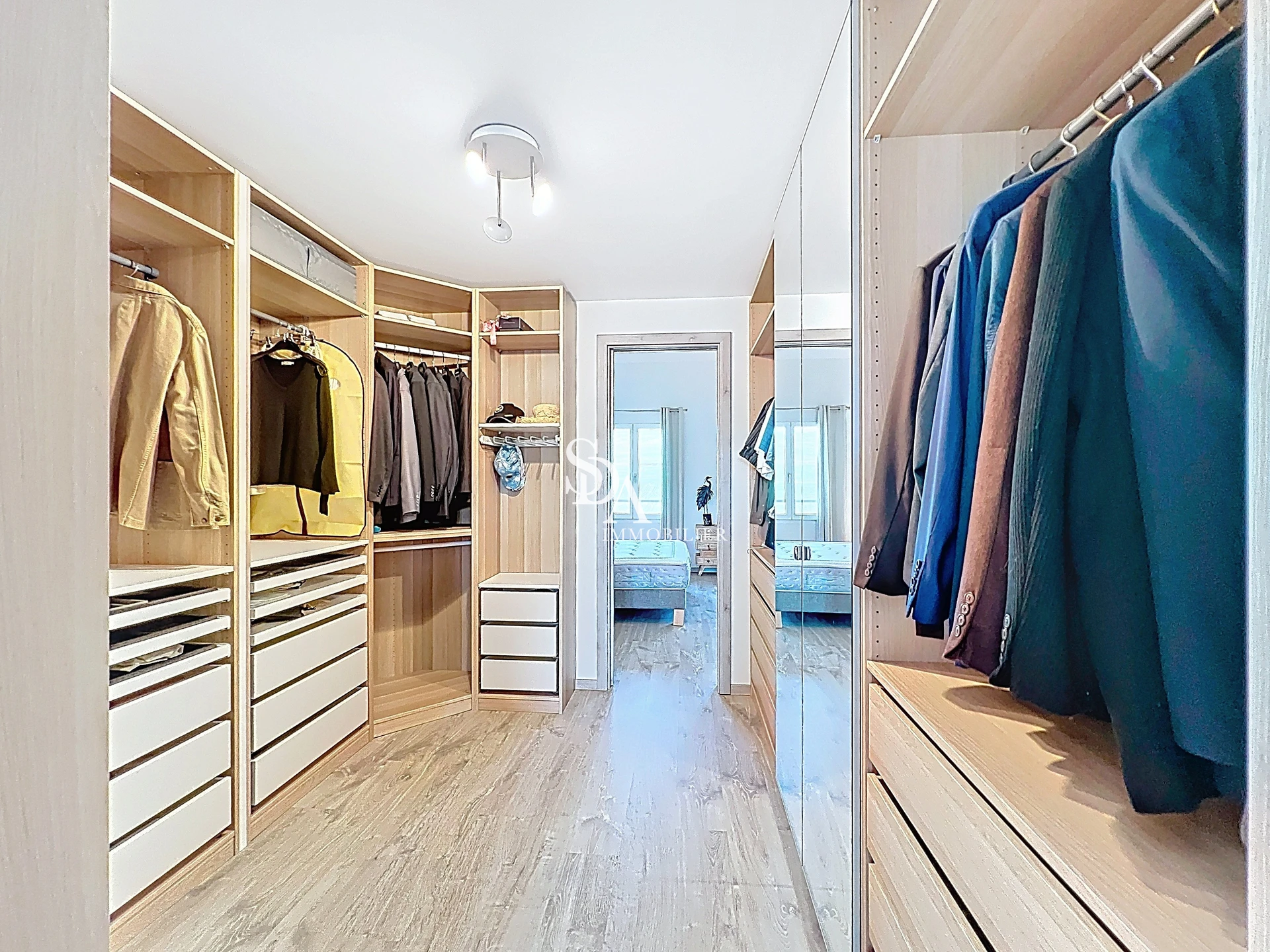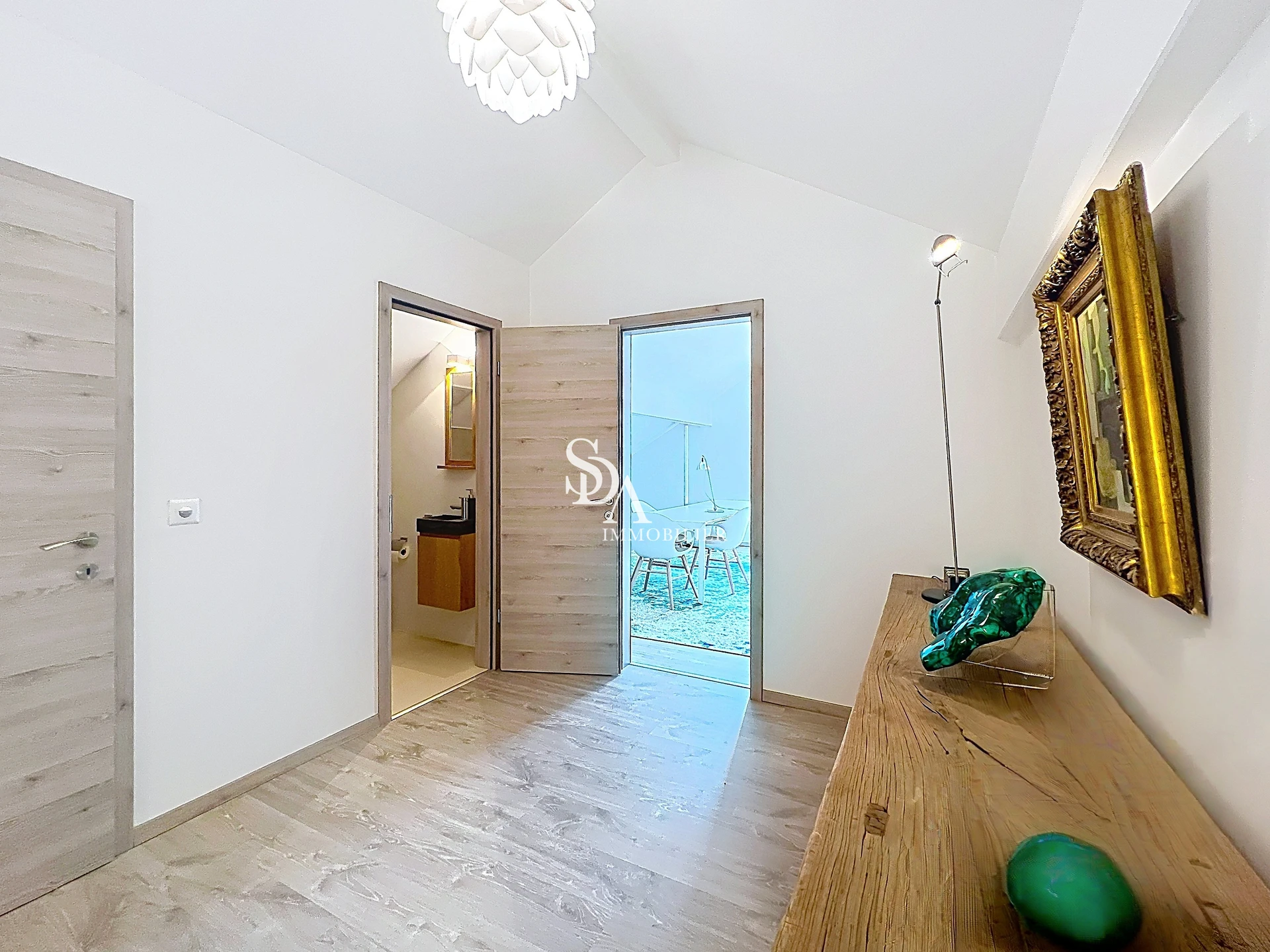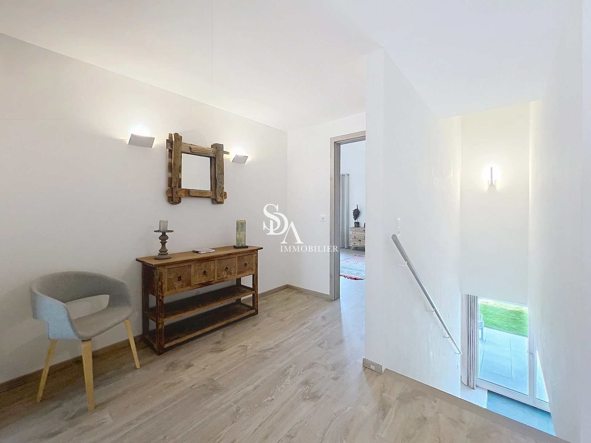 La maison dispose de cinq confortables chambres à coucher. Les grandes fenêtres assurent une inondation de lumière naturelle, et le sol en parquet dans certaines pièces ajoute une touche de chaleur. Les trois salles de bains offrent une finition moderne avec des matériaux de qualité, notamment des vasques élégantes et des accents décoratifs raffinés.
