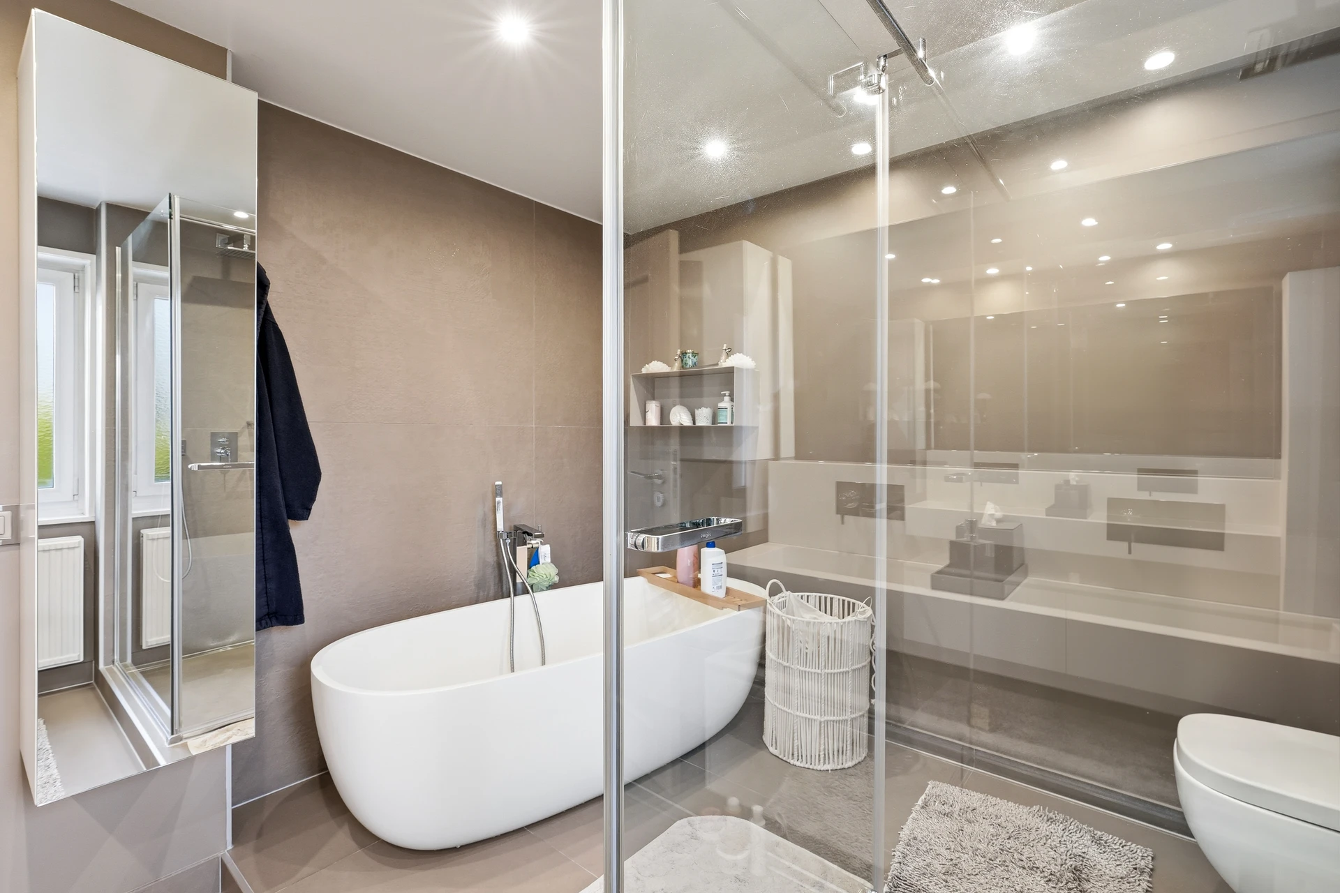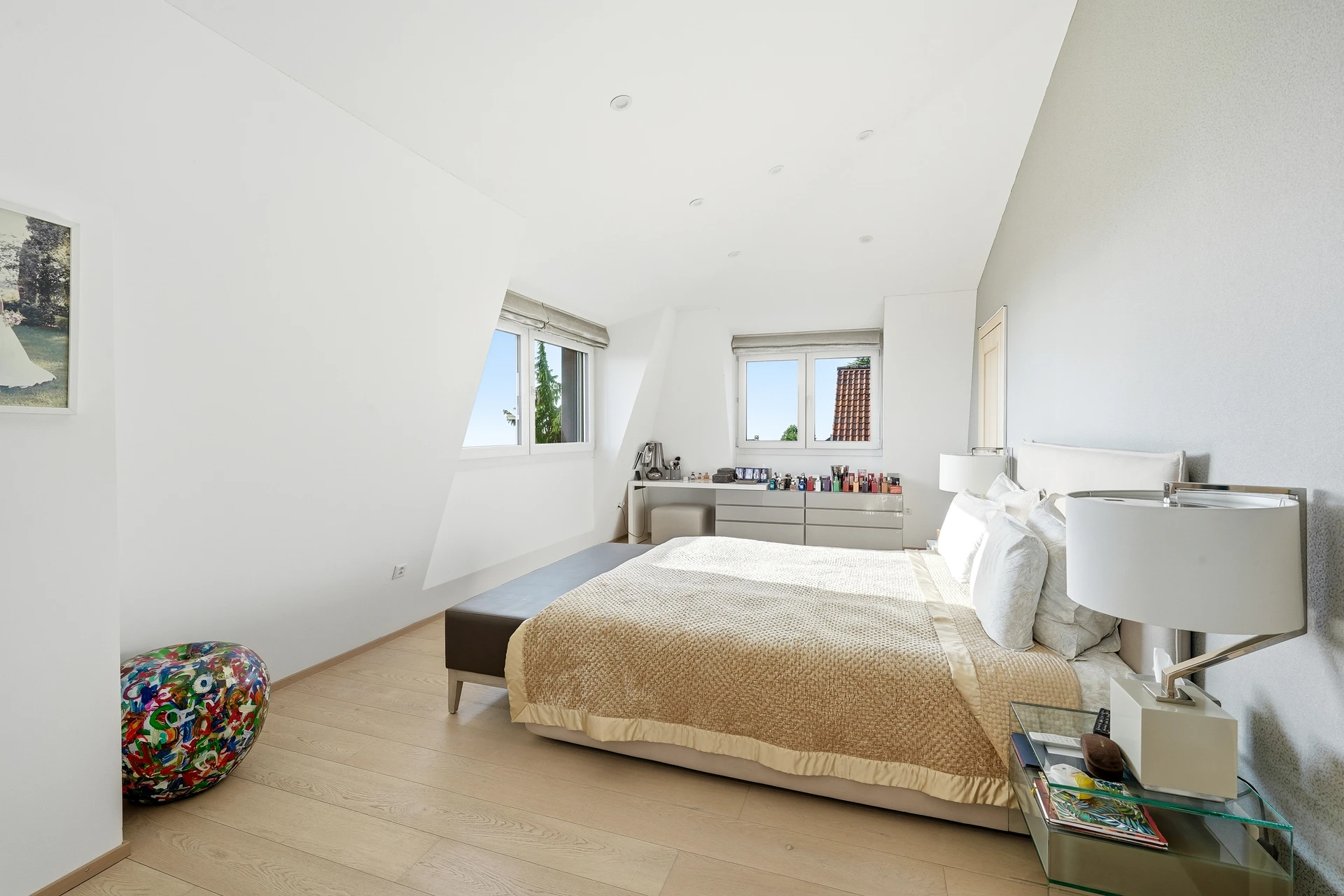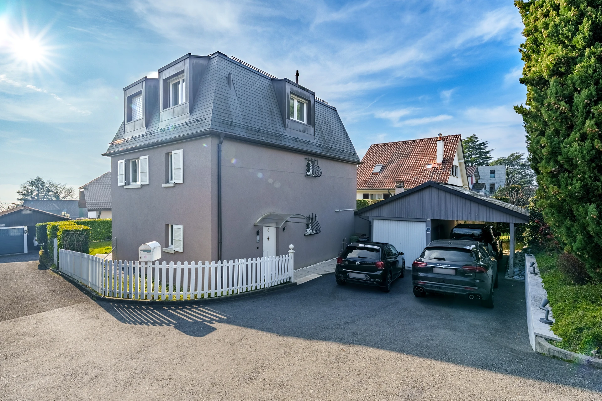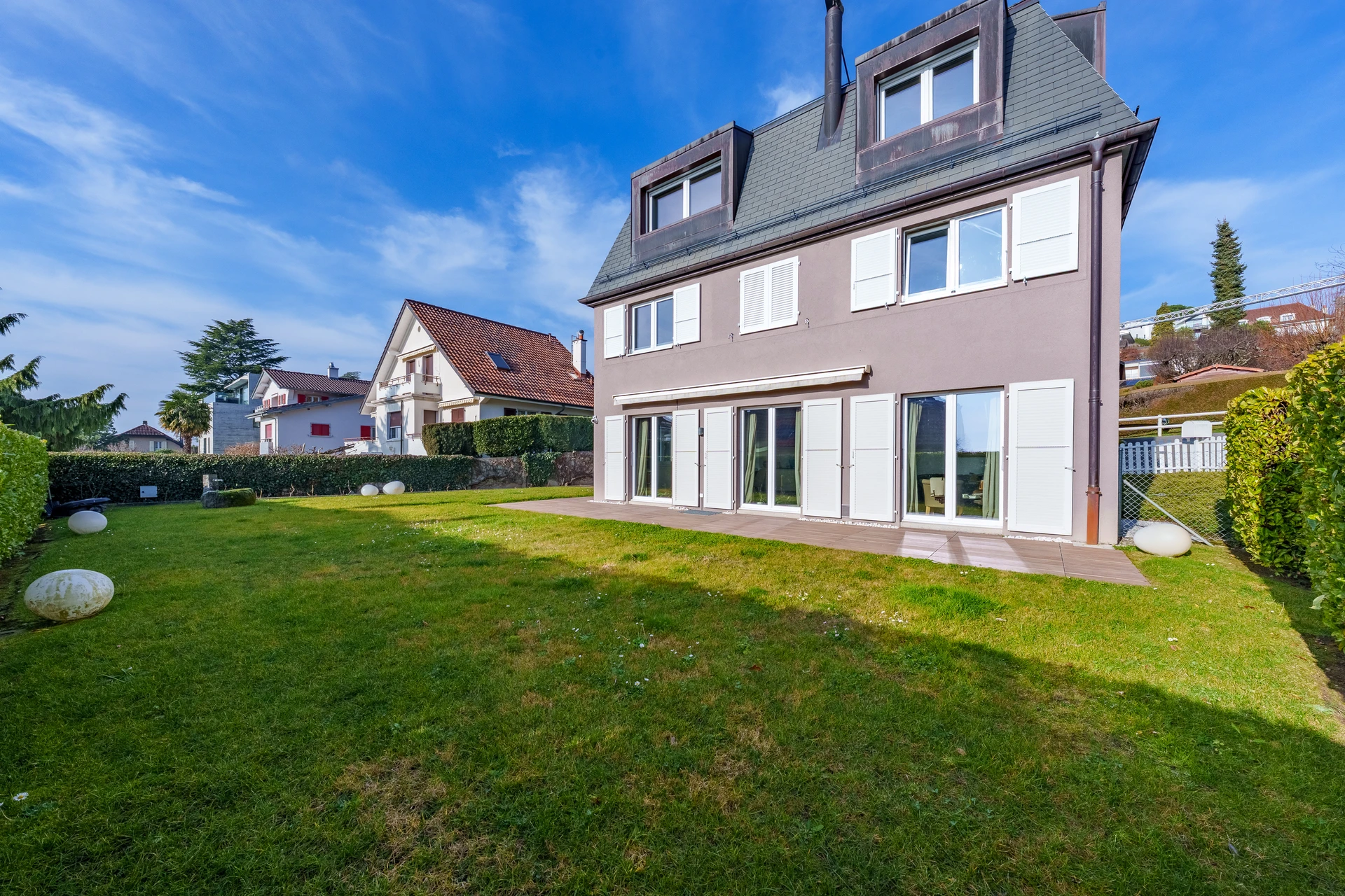 Les extérieurs, très bien aménagés, proposent de belles terrasses et un jardin plat, parfaits pour profiter des beaux jours. Très belle vue sur le lac depuis les étages.